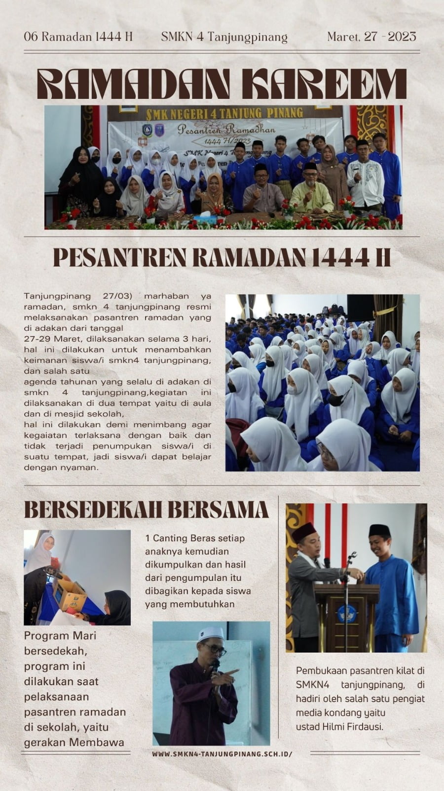 Skanpattpi – Tanjunginang, Marhaban ya Ramadan, SMKN 4 Tanjungpinang resmi melaksanakan Pesantren Ramadan yang diadakan dari tanggal 27-29 Maret 2023, dilaksanakan selama