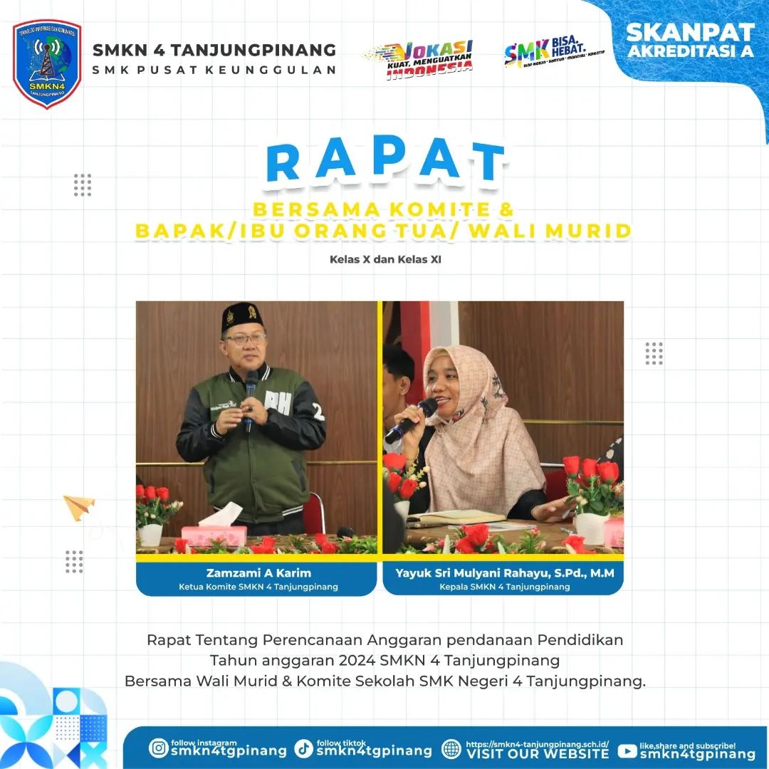 SMKN 4 TPI – Pada Hari Rabu tanggal 22 Mei 2024 bertepatan di aula SMKN 4 Tanjungpinang melakukan rapat Bersama komite,sekolah,orang tua