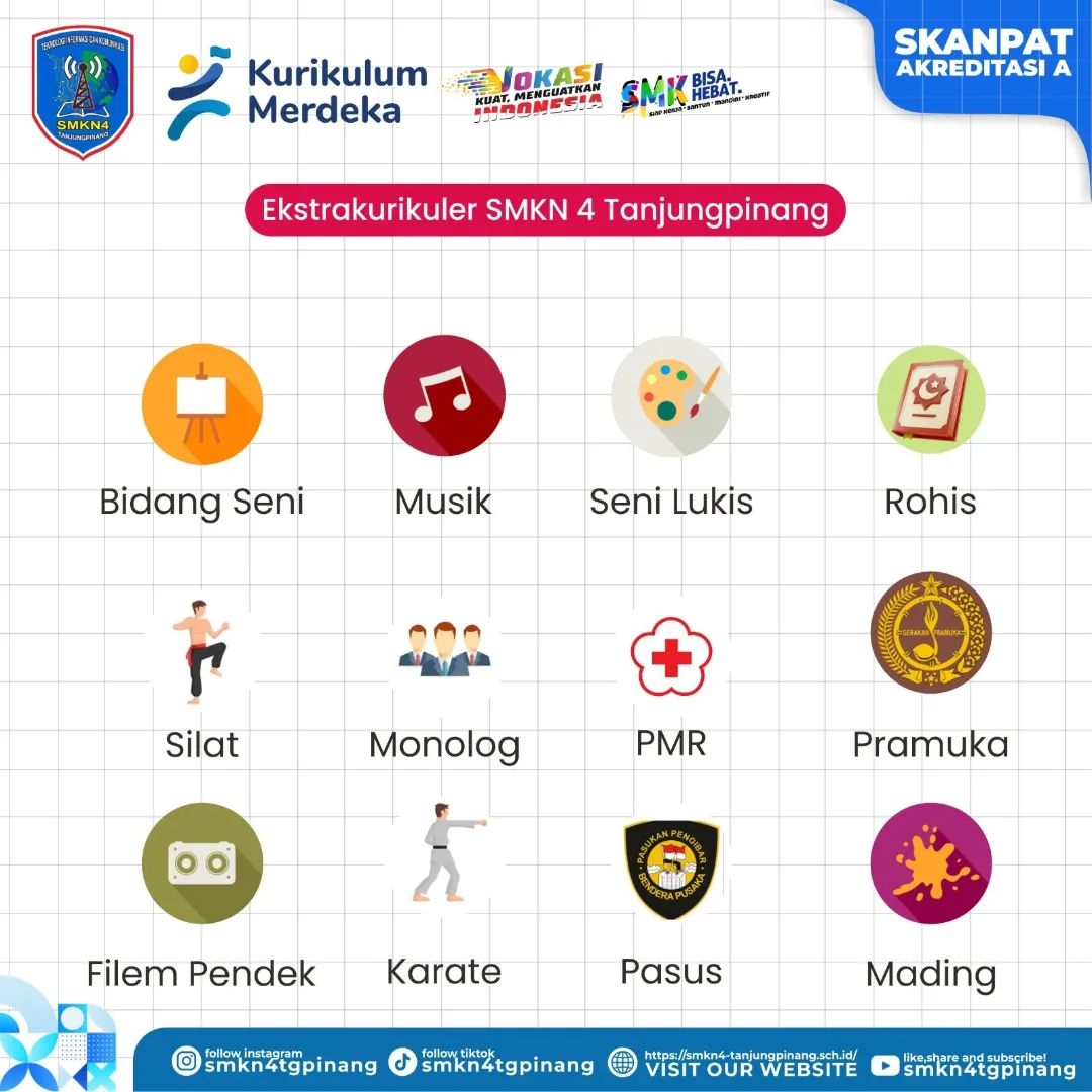 Di SMKN 4 Tanjungpinang terdapat daftar kegiatan Ekstrakurikuler, kegiatan Ekstrakurikuler ini bisa dilihat pada infografis dibawah ini.