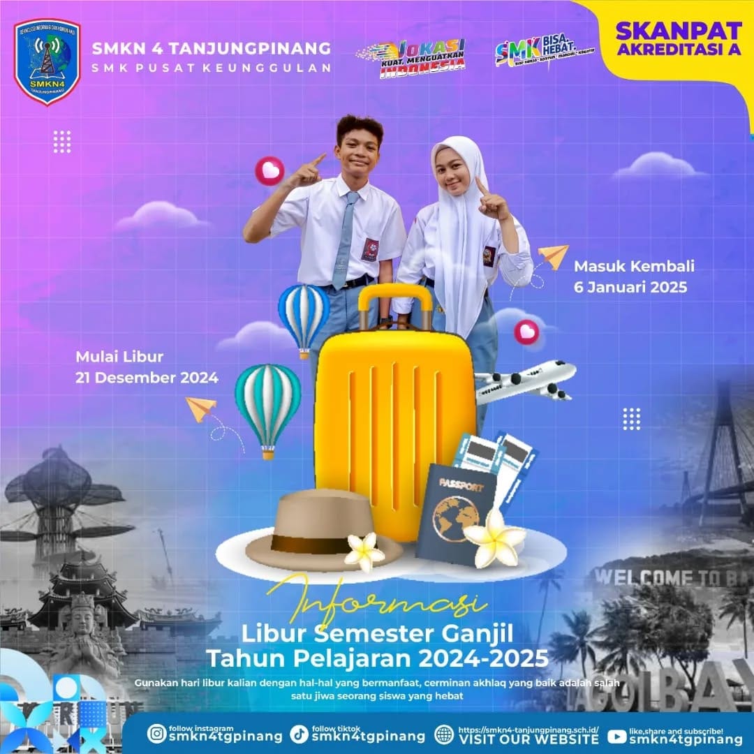 Hai sobat skanpat Tanjungpinang, informasi libur semester ganjil tahun pelajaran 2024-2025, libur dimulai tanggal 21 Desember 2024 dan masuk kembali tanggal 6